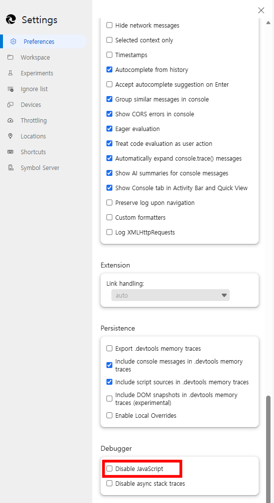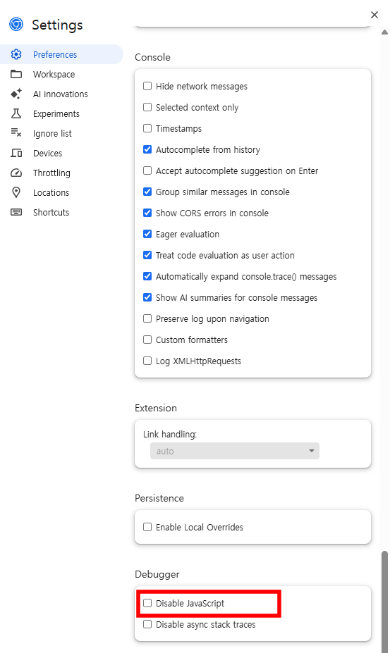 설정 화면에서 Preferences 메뉴 아래 Disable JavaScript라는 문구를 찾아서 체크해주면 된다.